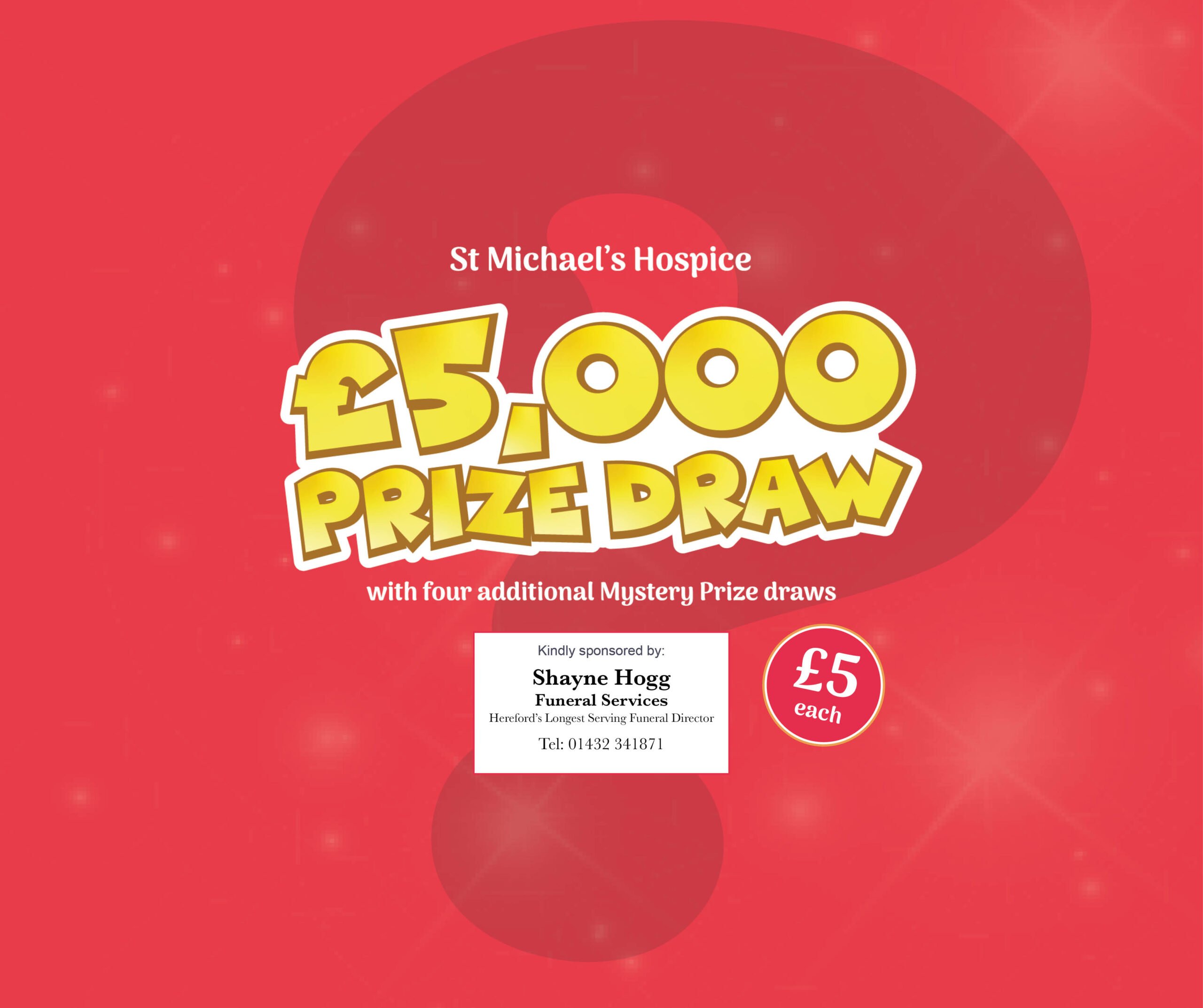 St Michael’s Hospice Draw 2026 Prizes 1st prize: £5,000 cash prize, 2nd prize: £500, 3rd prize: £50 plus 5 x £10 cash prizes. The draw will be carried out in person at St Michael’s Hospice on Thursday 26th March 2026. The prize winners will be contacted by phone where possible. Prizes are sent out by post within 7 working days of the draw or can be collected from the hospice. A list of winning raffle numbers will be available on our website, on display in our shops and by contacting the Fundraising Team on 01432 852602 during normal office hours.
