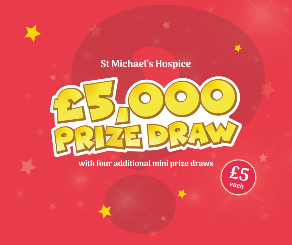 All profits from the St Michael’s Hospice Lottery and one-off draws go directly towards funding hospice services, which provide care for adults living with a life-limiting illness and their families.