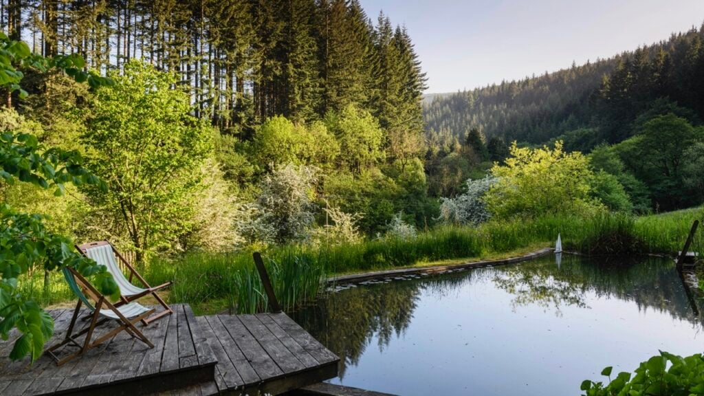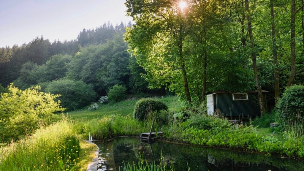 Discover a natural swimming pond, sculpted trees, a treehouse, a Silent Space, and a stream and river running through the grounds. A meadow is managed as woodland pasture to encourage biodiversity, welcoming bees, butterflies, birds, and all visitors alike.
