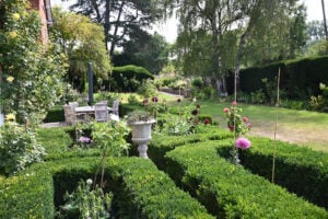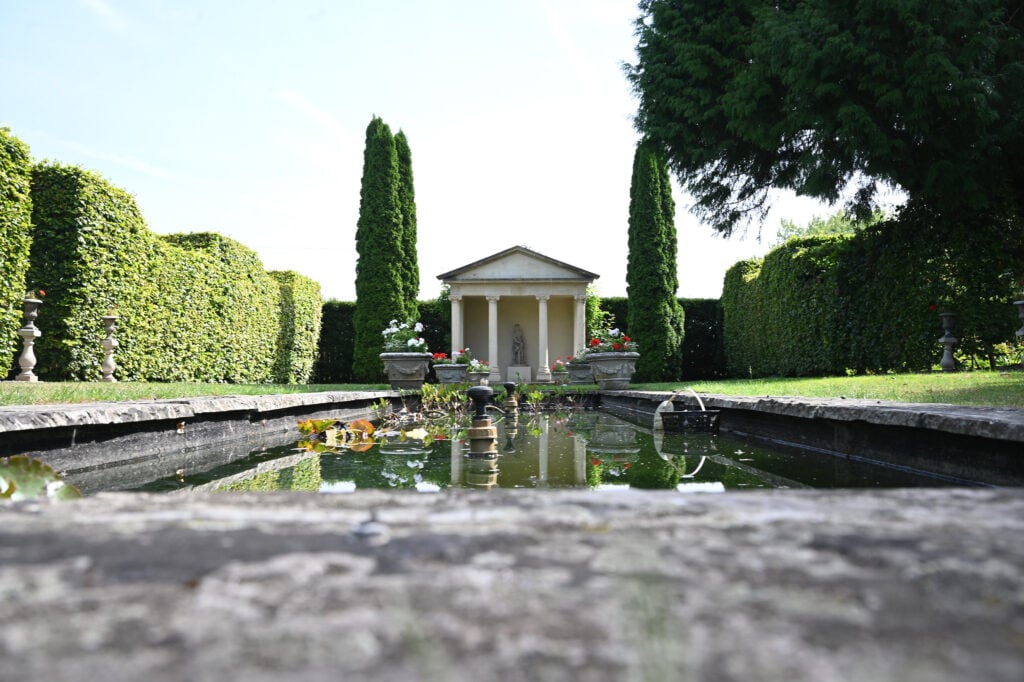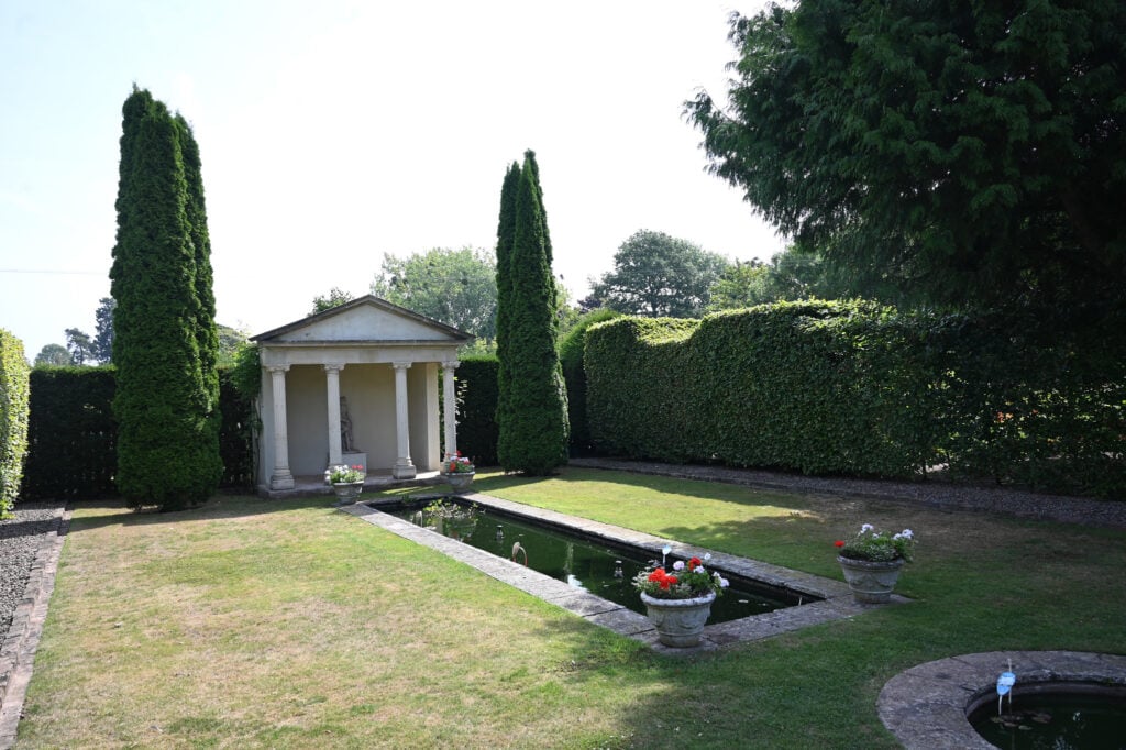 Explore a secluded secret garden planted in soft blue, yellow, and white tones, before reaching the croquet lawn with its charming C18 summer house. A temple garden with ponds offers a moment of calm, followed by herb and nosegay planting and a productive vegetable, cutting, and soft fruit garden arranged around the greenhouse on the paddock.